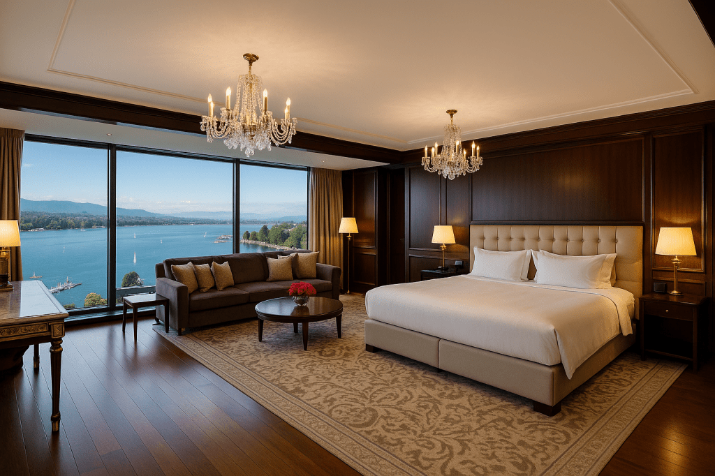 Apartmá, které zabírá celé horní patro hotelu. Dvanáct ložnic, výhledy na Ženevské jezero, piano Steinway, vlastní výtah a bezpečnostní systémy, které využívají státníci a miliardáři při tajných návštěvách.