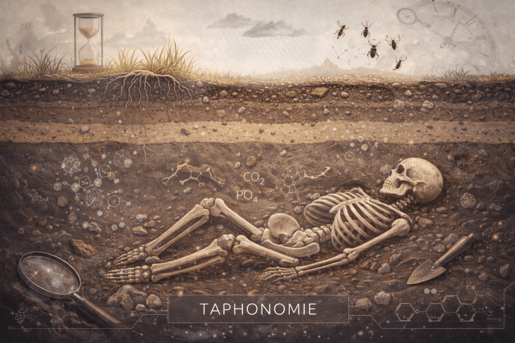 Taphonomie je věda, která studuje, co se děje s tělem po smrti. Zaměřuje se na procesy rozkladu a na vliv prostředí, času, klimatu a zvířat na ostatky. Tento obor je klíčový pro pochopení toho, jak se těla mění po pohřbení nebo vystavení přírodním podmínkám. Taphonomie hraje zásadní roli v archeologii a paleontologii při studiu dávných civilizací a vyhynulých druhů. Velmi důležitá je také v kriminalistice, kde pomáhá odhadnout dobu smrti. Díky ní lze lépe rekonstruovat události, které se odehrály v minulosti.