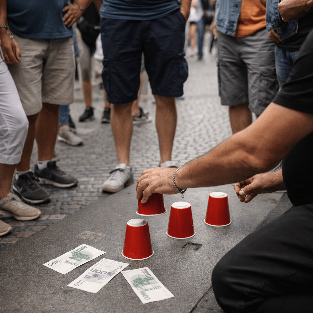 Typickým příkladem je hra s kelímky a kuličkou nebo karty na chodníku. Na první pohled to vypadá jako jednoduchá hra, kde lze snadno vyhrát peníze. Ve skutečnosti je hra vždy zmanipulovaná a nemáš šanci uspět. Lidé, kteří zdánlivě vyhrávají, jsou často součástí podvodu a mají nalákat další oběti. Jakmile se zapojíš, peníze rychle zmizí. Jakmile někde vidíš sázkovou „hru“ na ulici, je jisté, že jde o podvod.