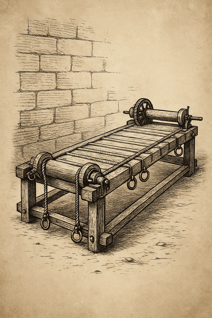 The Rack patří k nejznámějším historickým nástrojům. Oběť byla položena na dřevěnou konstrukci, kde se ke končetinám přivázali provází či řetězy, které se postupně napínaly.